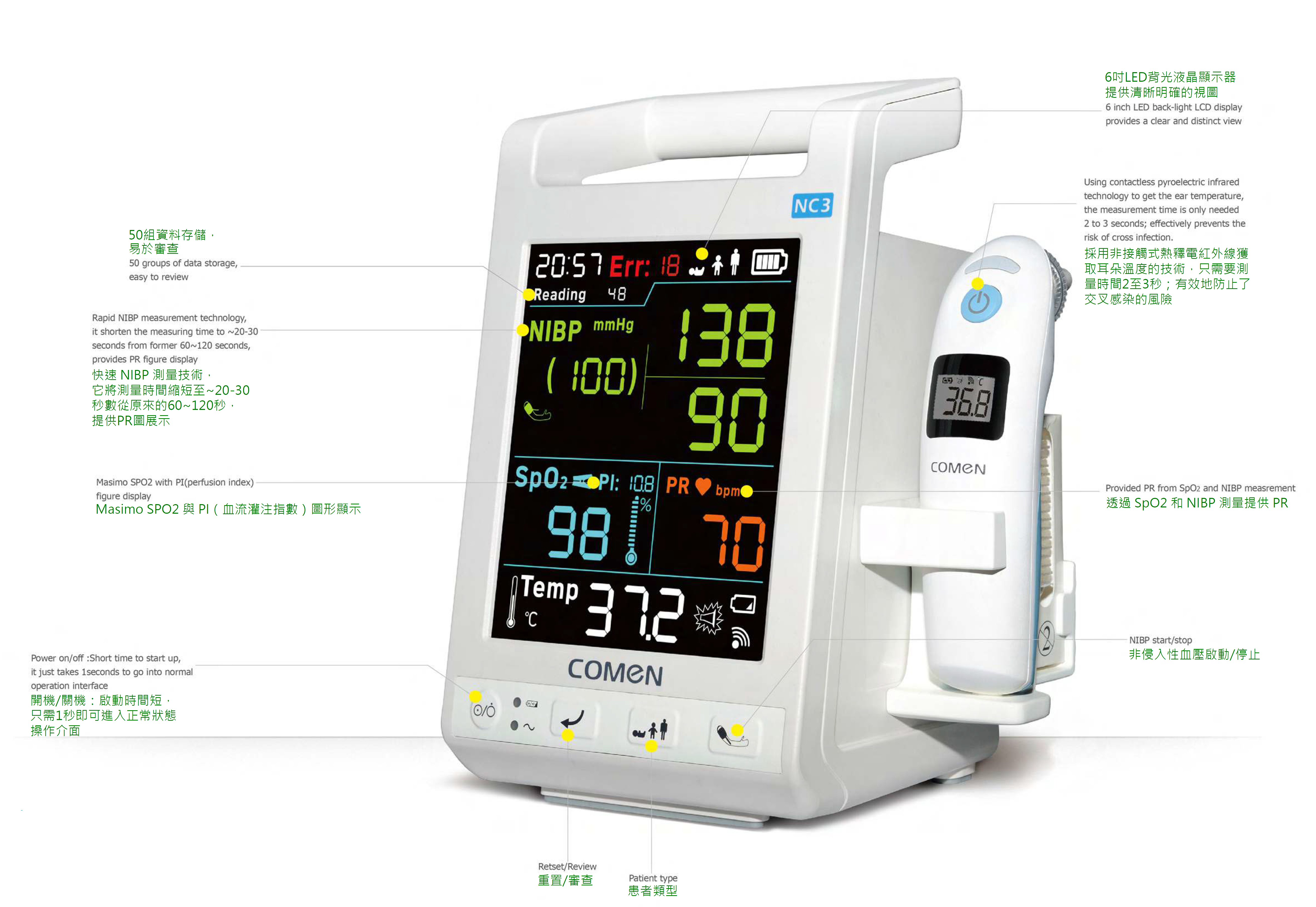 Comen NC3 生命徵象監測儀 – 專為抽查患者生命徵象的重要參數而設計,如 NIBP、SPO2、溫度和心率。採用紅外線耳溫測量技術,耳溫計可在~2-3秒內快速讀取溫度數據,並在監視器上傳輸和顯示數據透過耳溫計和生命徵象監測器 NC3 之間的內建 WiFi。它集智慧與美感於一身超級鋰電池和清晰螢幕的設計,完全滿足醫院使用的最快支援。