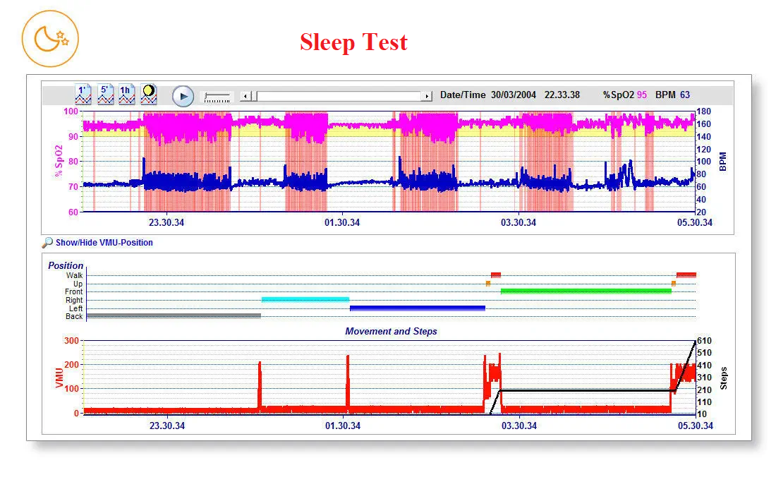 MIR Spirodoc®可為用家進行睡眠血氧飽和度分析,並能記錄不同時間的血氧飽和度以及身體位置,提供可靠快速而的診斷。